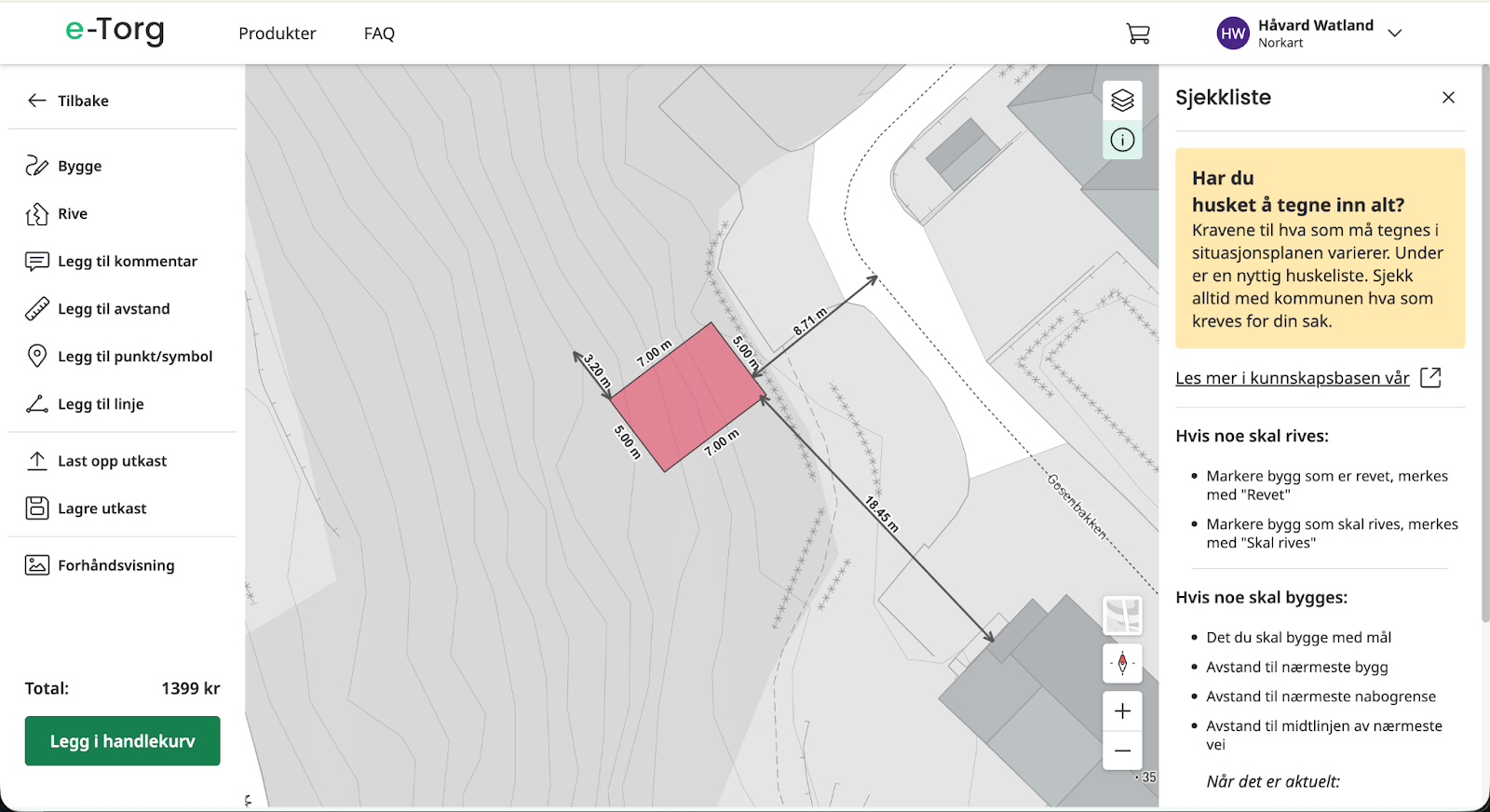 I “Reguleringsplaner” finner du reguleringsplaner som er mer detaljerte enn kommuneplanen og gjelder for et mindre område. Her finner du mer detaljer om bebyggelse og om det er regulert inn byggegrenser. Det gjør mulig å plassere tiltaket riktig i forhold til dette. I eksempelet under er byggegrense langs veien tegnet inn som en stiplet linje.