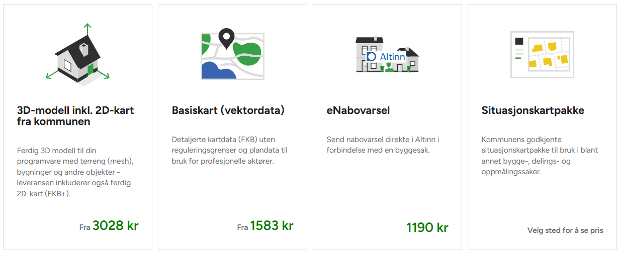For eksempel kan du besøke Bodø e-Torg for å finne et utvidet utvalg som inkluderer arealplaner, eiendomsgebyr, målebrev, situasjonskart, ledningskart, og mye mer – i tillegg til de ordinære landsdekkende produktene.